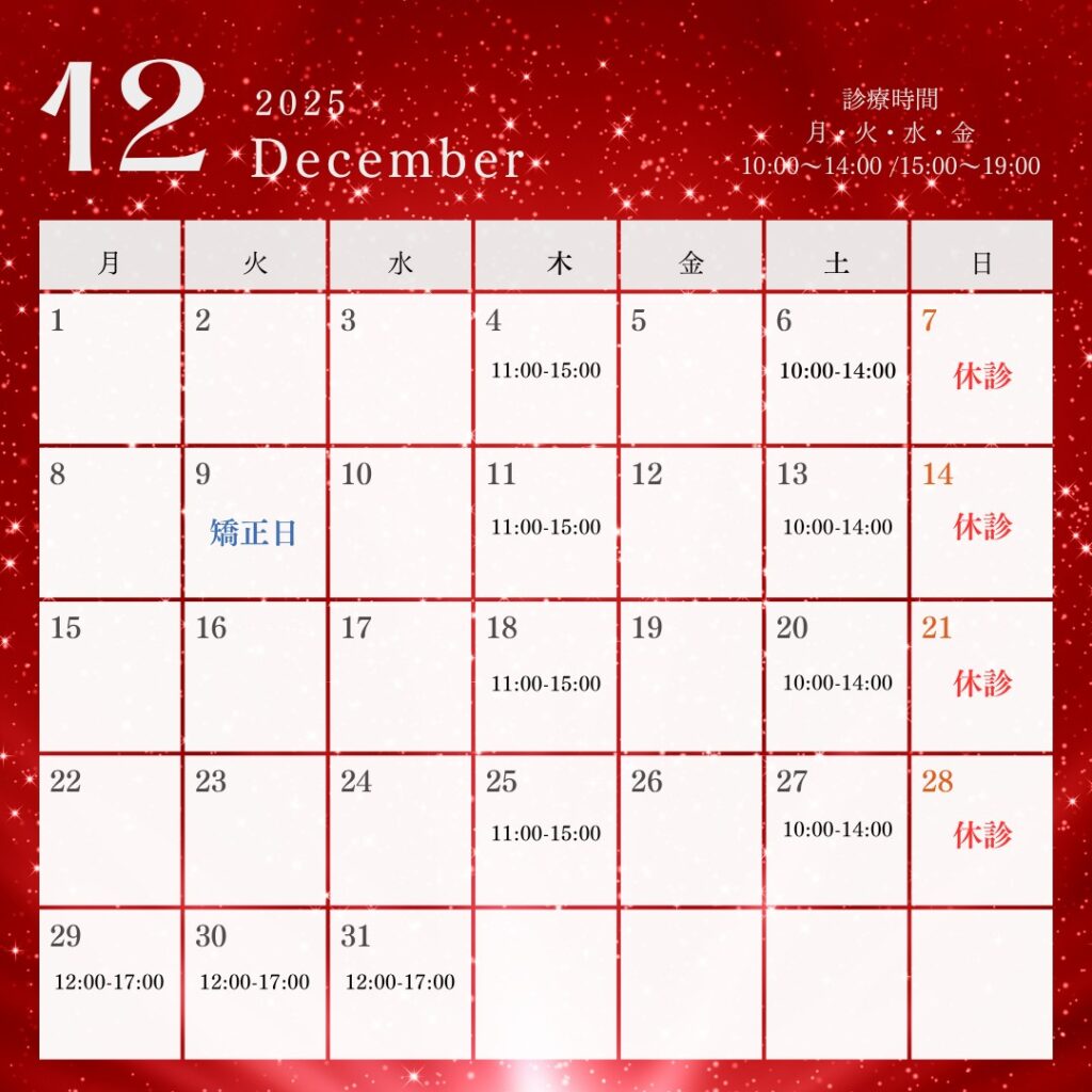 Instagram 03-6804-2829 WEB予約 Home 診療科目 料金表 スタッフ紹介 アクセス ブログ ブログ TOP ブログ お知らせ 12月の休診日と矯正日につきまして 2025年11月11日【お知らせ】 12月の休診日と矯正日につきまして <休診日>日曜日・祝日 <木曜日診療>11:00〜15:00 <矯正日>12/9(火)10:00〜19:00 当院は完全予約制です。→キャンセルポリシー ご予約は、下記から承っております。→ウェブ予約ページ ⚠️注意⚠️・1週間以上先の10:00、18;00、土曜日のご予約・1ヶ月以上先のご予約・矯正のご予約上記につきましては、お電話または公式LINEにてお問い合わせをお願いいたします。※お急ぎの方や予約希望日時の2時間前を過ぎたご予約は、お電話にてご連絡ください。 < 前の記事へ 次の記事へ > 最近の投稿 年末年始の臨時診療日のお知らせ むし歯・歯周病が脳の病気と関係しているって本当? 臨時休診のお知らせ : 11月20日 🎄クリスマスキャンペーン実施中🎁 12月の休診日と矯正日につきまして カテゴリー お知らせ 日記 未分類 歯科のお話 月別 2025年12月 2025年11月 2025年10月 2025年9月 2025年8月 2025年7月 全月別