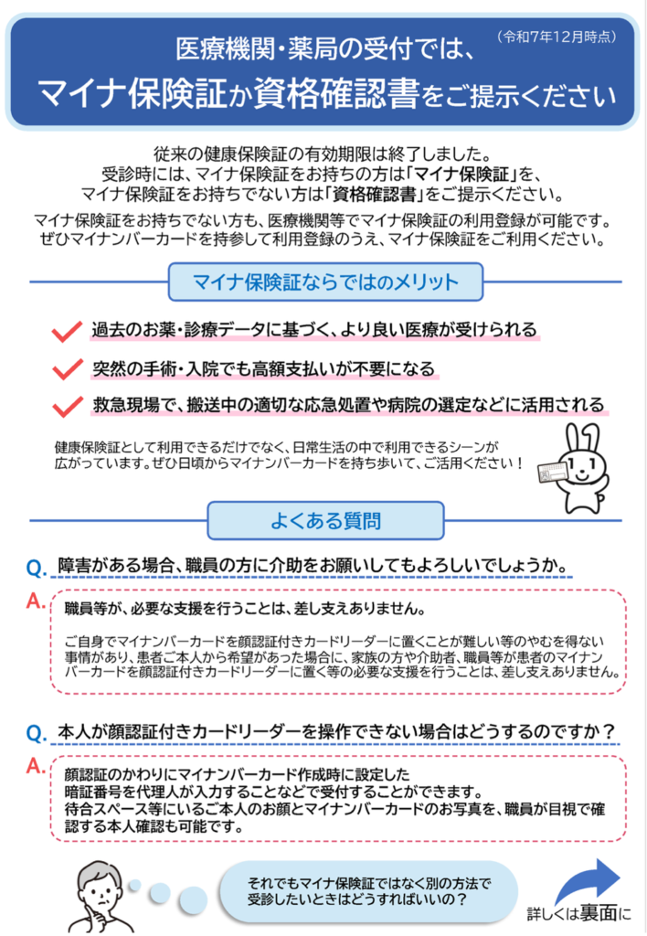 12月に入り、現行の健康保険証が新たに発行されなくなることに伴い、マイナ保険証に関するお問い合わせが増えてきました。